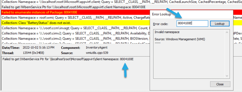 In CMTrace, using the log snippet below as an example, I copied the 8004100E error code and open Error Lookup window using the Ctrl-L command. Then pasted the error code before click Lookup button. From there I can see what this error message means in plain text. Thereby pointing me in the right direction. In this case I already know that App-V is not installed and therefore the WMI namespace doesn’t exist, so this error is to be expected. Which makes it not really an error.